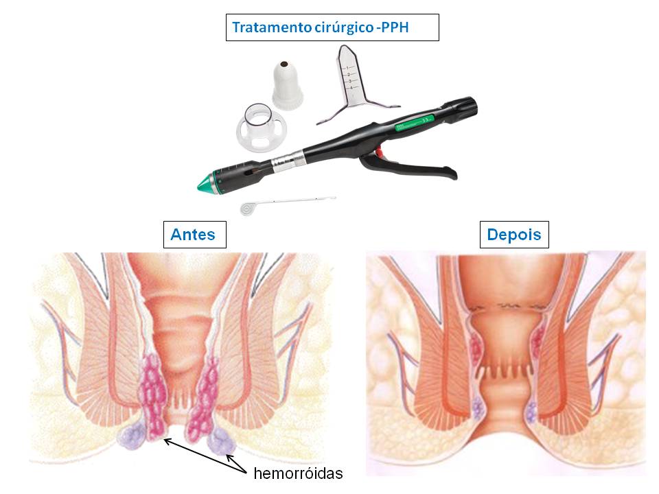 Opções para o tratamento cirúrgico de hemorróidas incluem hemorroidectomia (remove cirurgicamente tecidos hemorroidários em excesso), que funciona tanto para hemorróidas internas quanto externas, e outros procedimentos (por exemplo, hemorroidopexia grampeada (PPH) e ligadura arterial hemorroidária), que possuem melhores resultados para hemorróidas internas